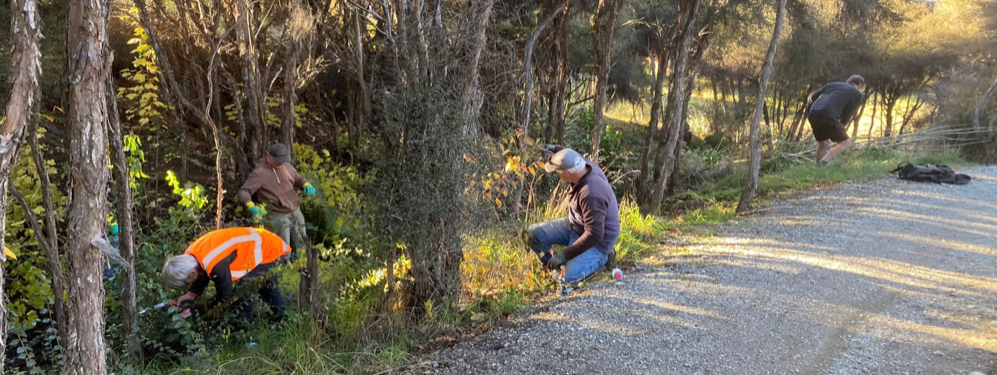 Community members removing weed species near the Albert Town Lagoon at a monthly working bee for Upper Clutha Wilding Tree Group volunteers